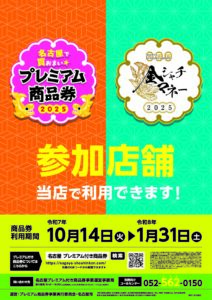 2025年10月11日 名古屋プレミアム商品券2025 2025年10月14日(火)より「名古屋プレミアム商品券」 ご利用いただけます。 紙商品券・電子商品券ともに使えます。 ・ご利用期間:2025年10月14日(火)~2026年1月31日(土) 自分はまだ。