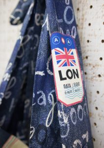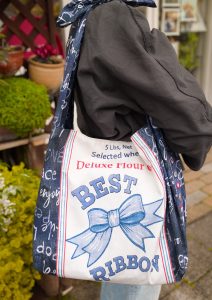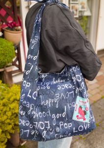デニム柄の布を組み合わせたワンショルダーバッグ。